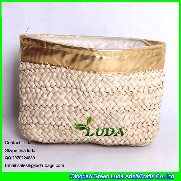 LUDA golden leather straw handbag zipper top summer straw clutch bag |